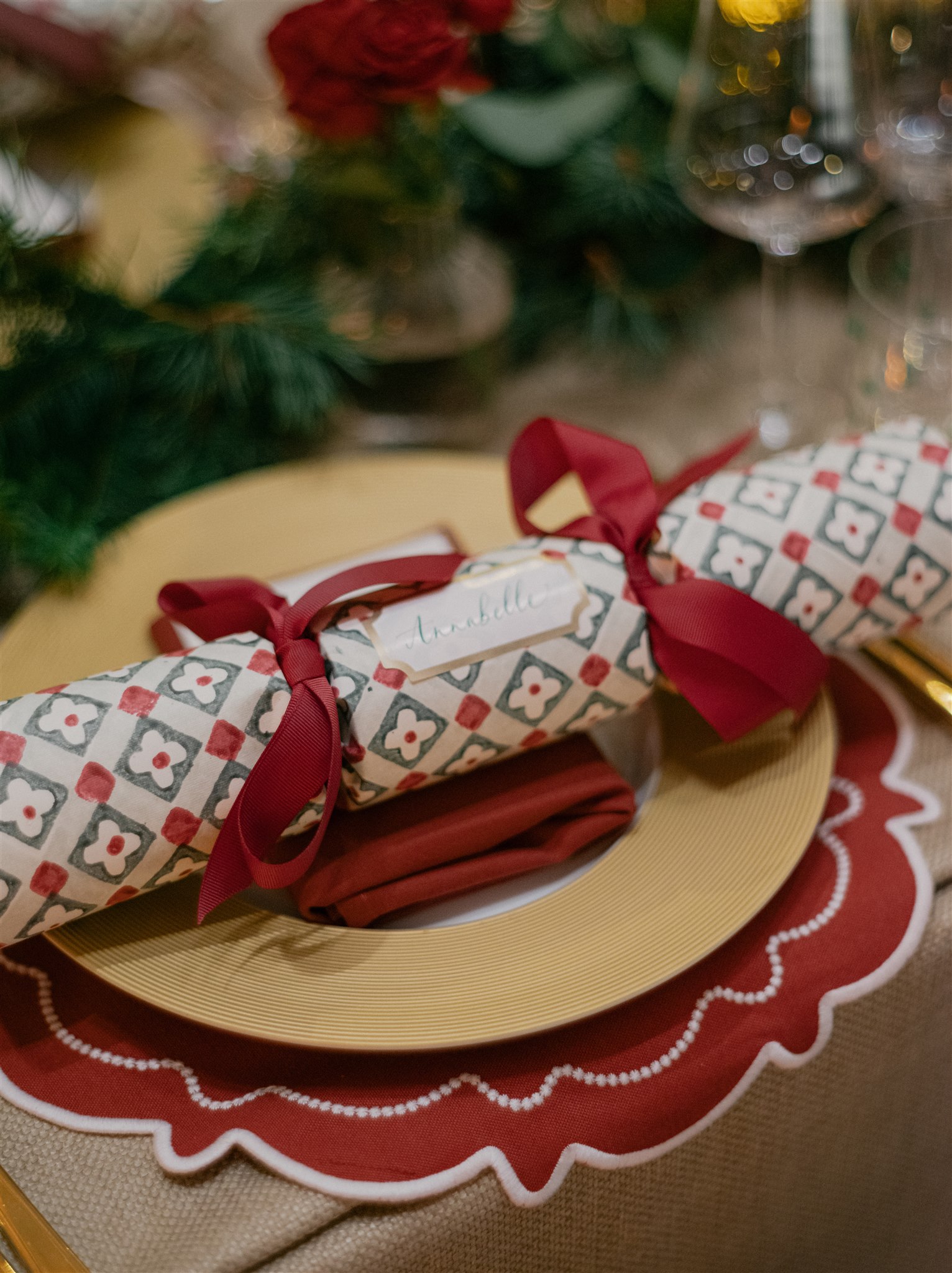 Two long, grand tables were laid in the centre of Raphael Court. The tables were clothed in a heavy cream linen and topped with red placemats, gold edged chargers, a fun spotted water glass and gold cutlery. The deep wood chairs featured a velvet green seat pad completing the Christmas inspired palette. Florals ran down the centre of the tables - red roses, pine cones and textured foliage wove around tall taper candles in deep red and green. On each place setting, a cracker, handmade in a hand printed patterned paper, featured the guests name and contained small gifts.