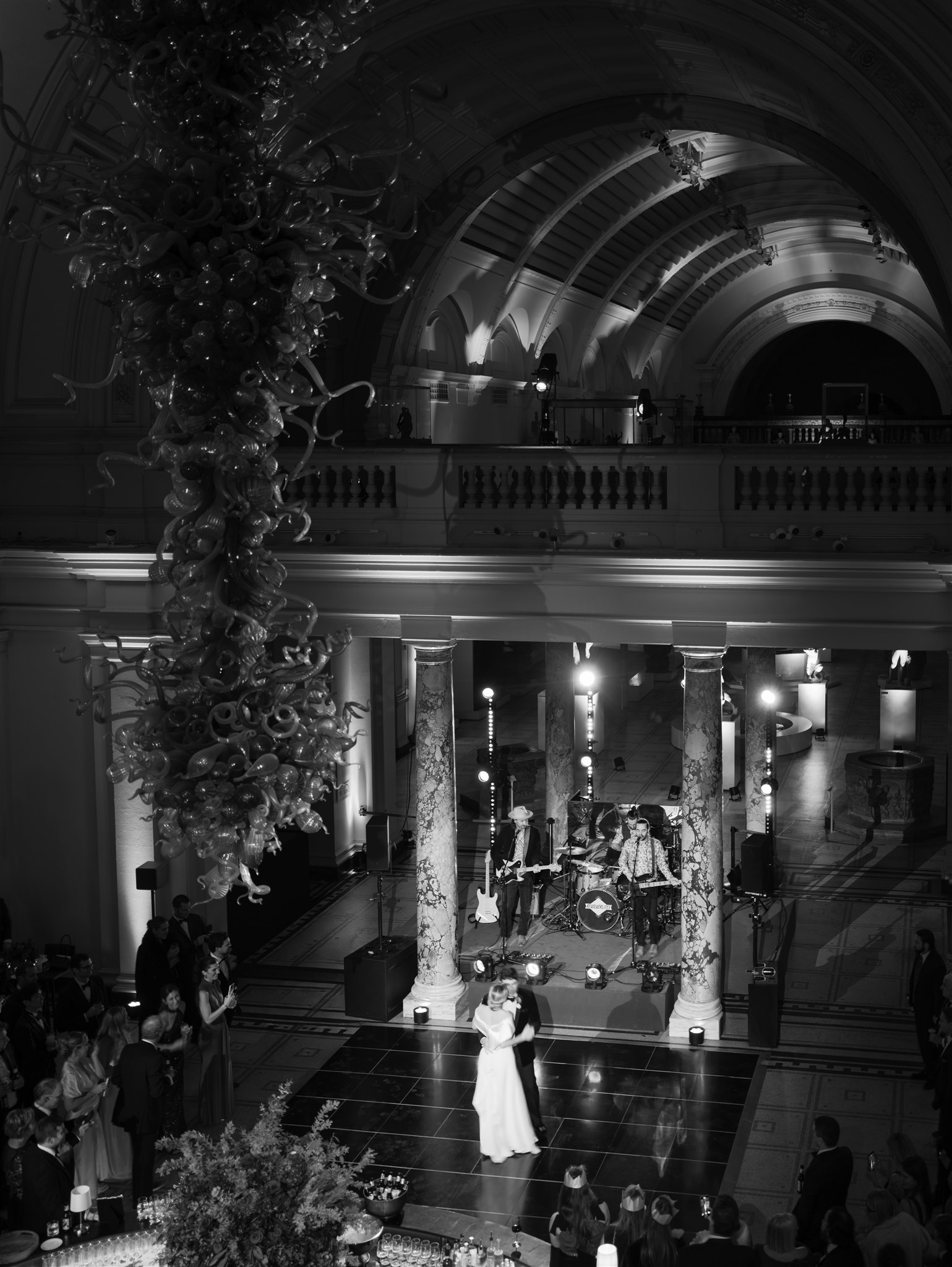 Traditional routemaster buses then transported guests to the V&A for the cocktail hour, dinner and dancing. The couple opted to keep the wedding focussed on British classics and served Gusbourne for their reception, amongst the sculptures of the Hintze Gallery. From here guests took a tour through the museum, ending in the magnificent Raphael Court. As the couple entered the room, the receptioin from guests was one of the most joy filled, exuberant welcomes we have seen. The bride and groom danced their way down between the two long tables before being seated for dinner.